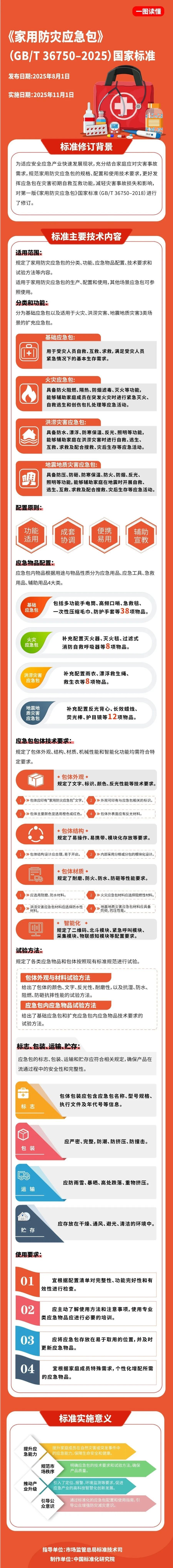 2025年11月1日起,《家用防灾应急包》国家标准(GB/T 36750—2025)正式实施。该标准旨在防御与减轻突发灾害事件影响,科学合理地配置个人、家庭应急救助用品,提高自救互救能力,支持遇险者尽快脱险。